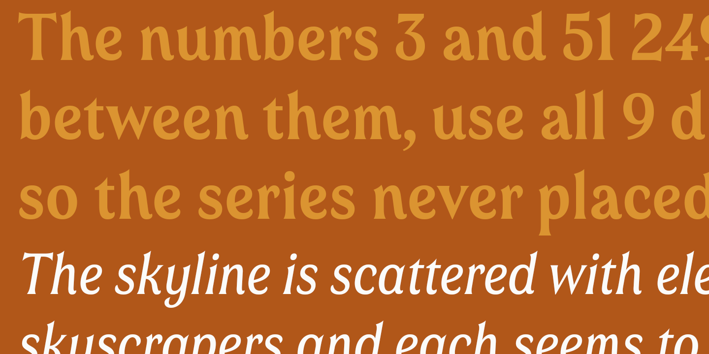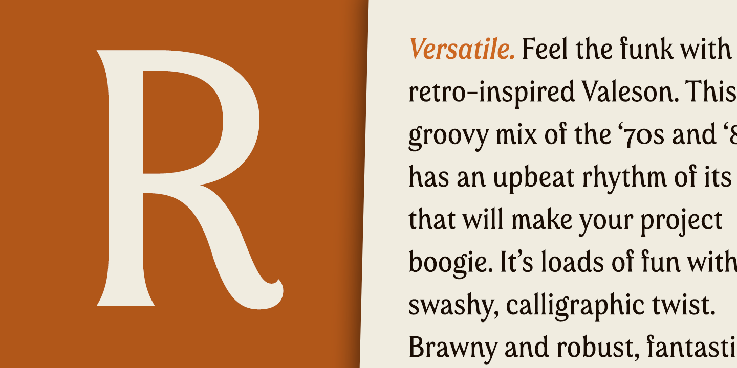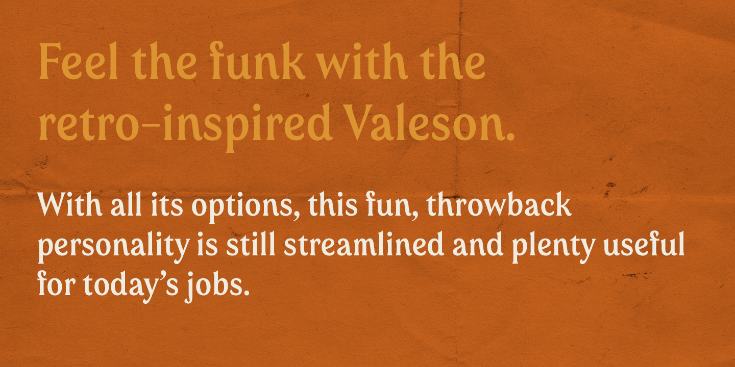 Push it to the max with plenty of weights. Denser weights are brawny and robust, fantastic for headlines, while medium weights are swell for short bits of text. With all its options, this fun, throwback personality is still streamlined and plenty useful for today’s jobs.