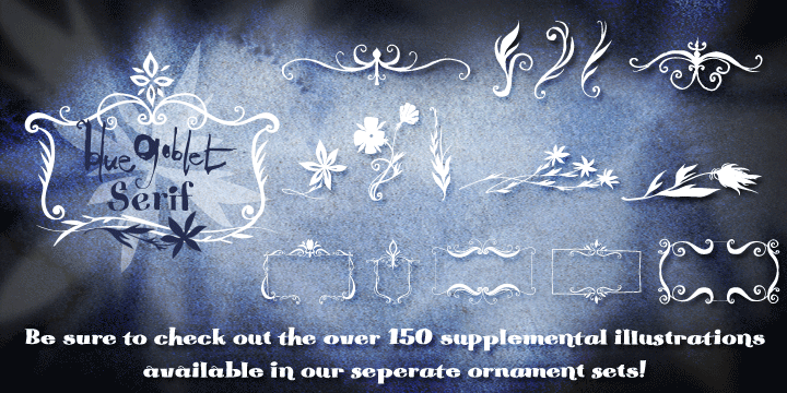 Not only is Blue Goblet Serif a excellent choice, it also is a member of a wide family of different fonts. You can use it side by side with the original Blue Goblet, and there are a wide range of ornaments available, totaling over 350 illustrations! These illustrations include frames, florals and other text ornaments that can be inserted into your text and resized at will. This makes the Blue Goblet series a great pick when you want a type system that works very well together for a very unique and consistent look. The Blue Goblet series continues to grow and be expanded, making it a valuable investment.