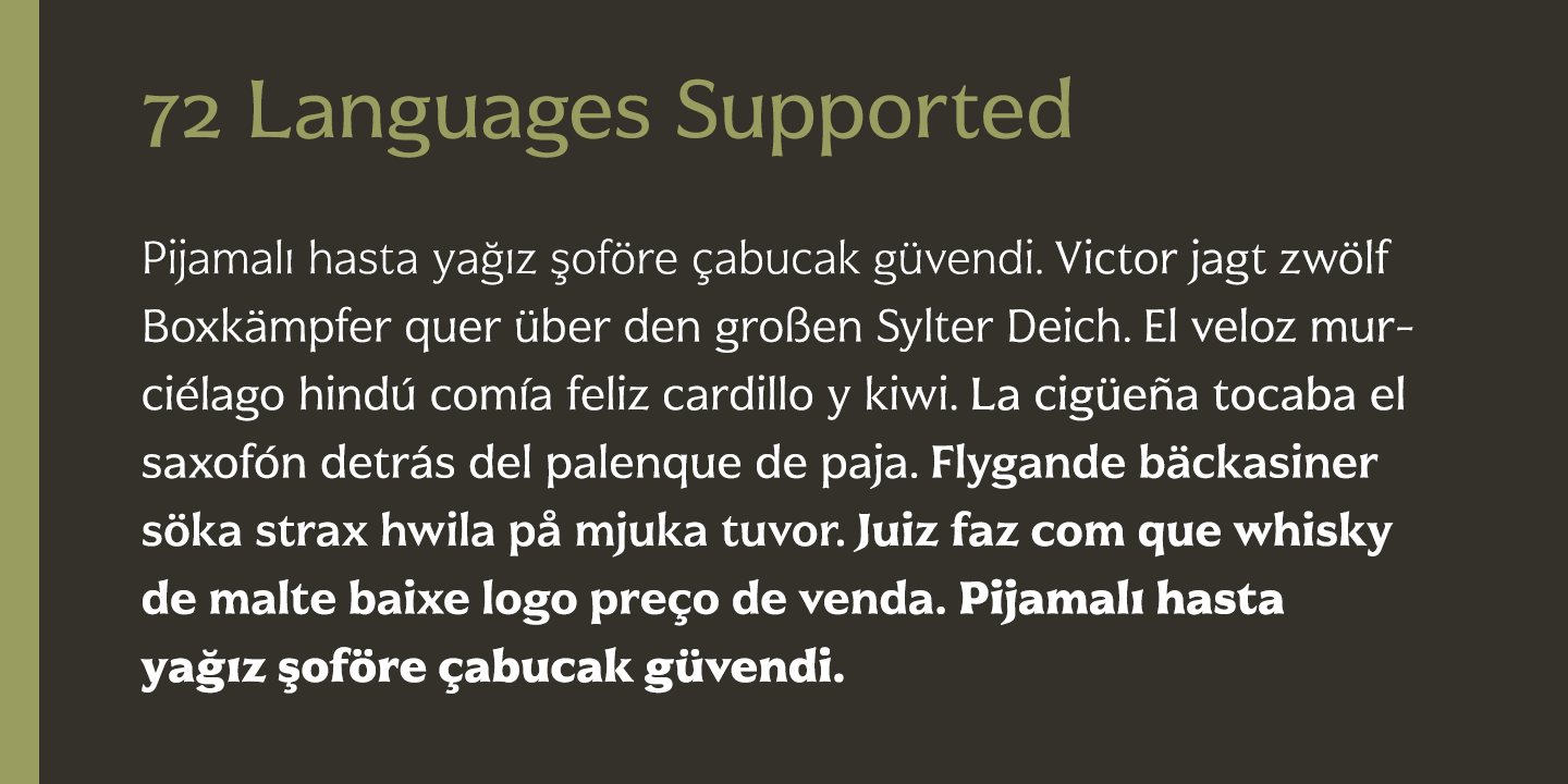 Civane supports OpenType features and comes with upright italics, alternates, ligatures, old-fashioned figures, titling and small caps. Preview all these features in the interactive PDF manual. The font family has 48 fonts, with three widths and eight weights. The font family also includes glyphs for 72 languages; over 550 glyphs per font stand ready for you to command throughout your design.