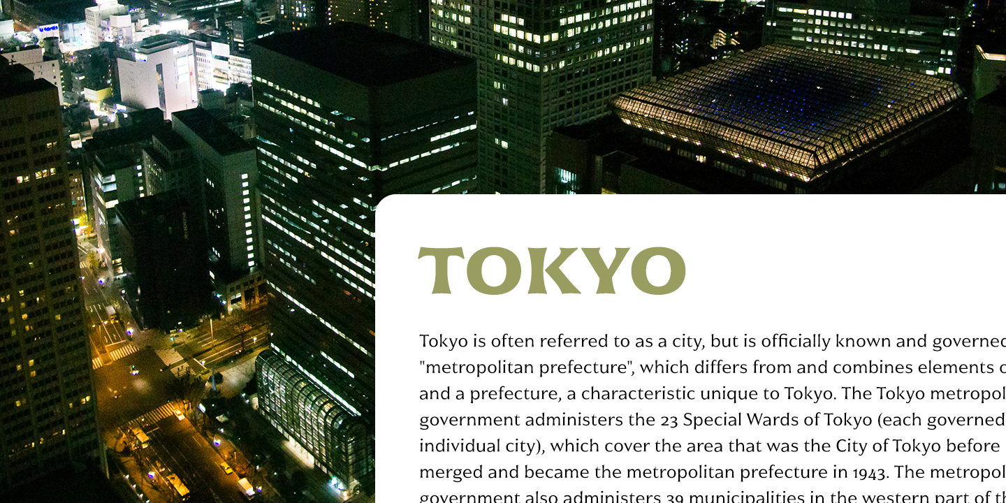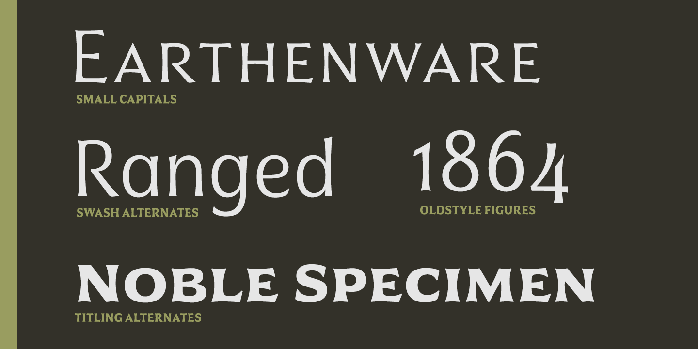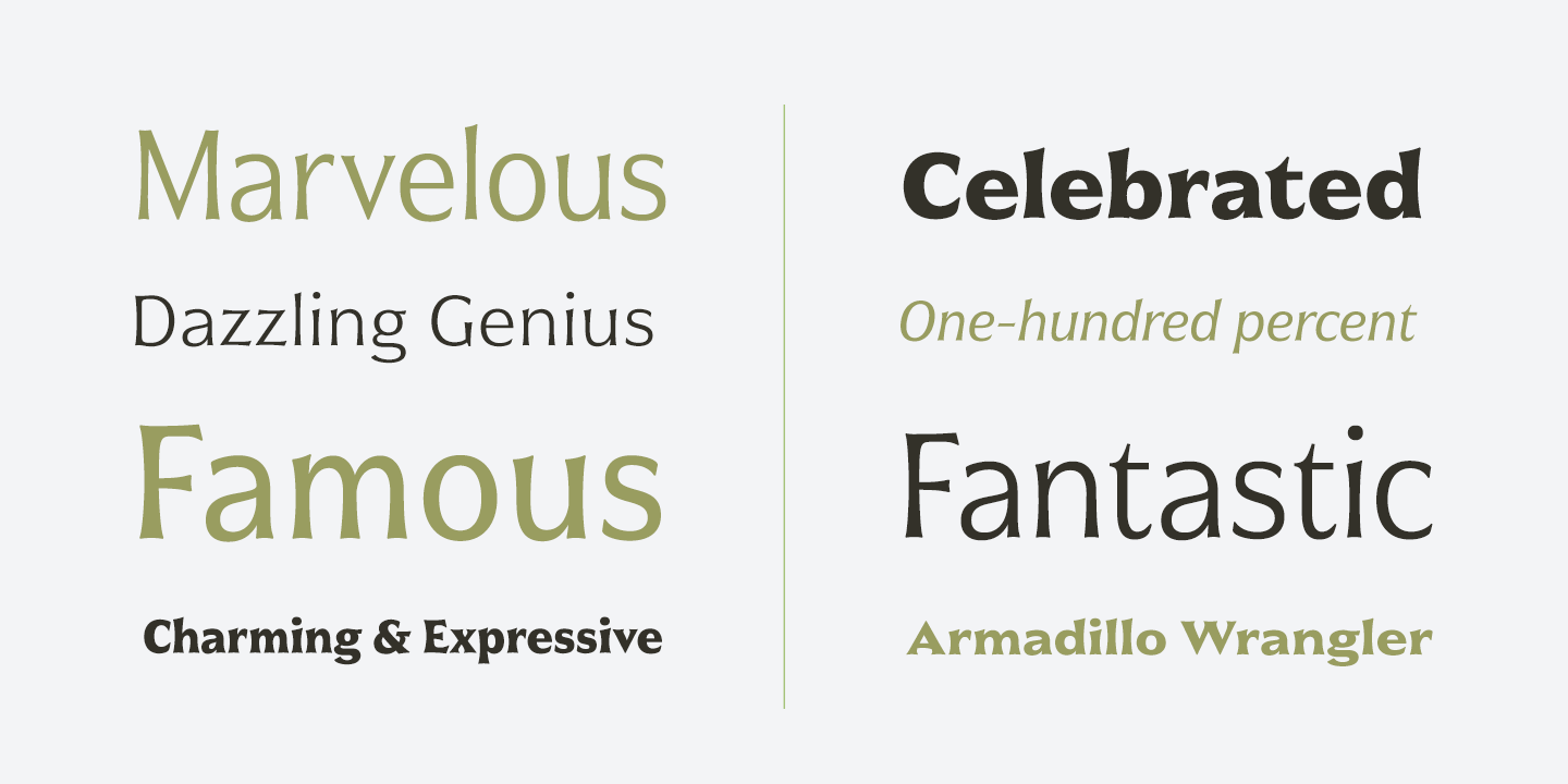 Civane is inspired by monuments of great civilizations, whose lofty inscriptions remain chiseled into the very stones and columns of their structures. The font’s medium contrast with its flared stroke ends lead the reader to feel the solemn presence found in these great obelisks and shrines. Even Civane’s thinnest weight holds a quiet power over its audience. Still, its classic lines provide a beautiful flow between the strong letters, allowing the reader’s eye to move easily across the page.