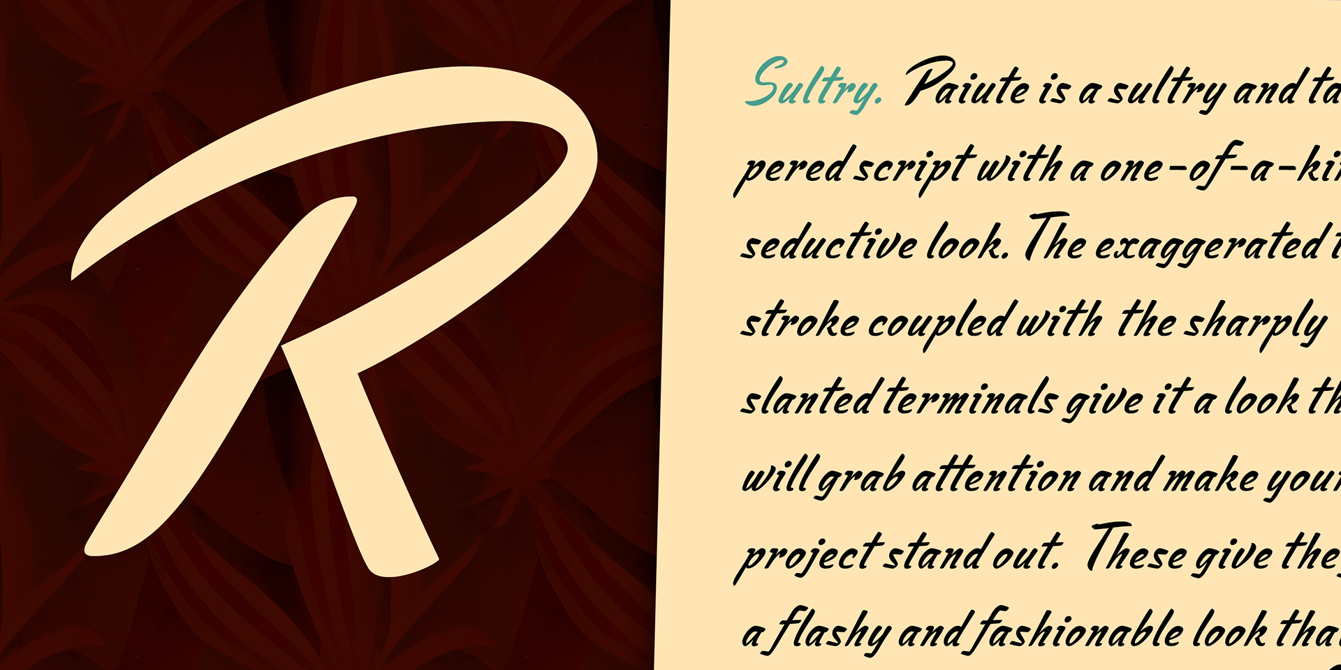 Whether you're designing a magazine cover, book cover, or movie poster, Paiute is the perfect choice for that extra touch of va-va-voom. It's like sprinkling glitter on your design - except it won't get stuck in your hair.