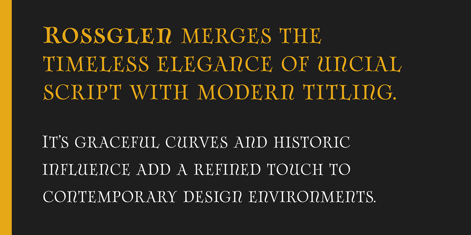 But Rossglen isn't just about raw power. Its range of weights lets you whisper legends or roar sagas. Alternate characters and ligatures are your secret arsenal, infusing designs with an air of ancient mystery. And with robust multilingual support, your message will resonate in any tongue, from Old Norse to Modern English.
