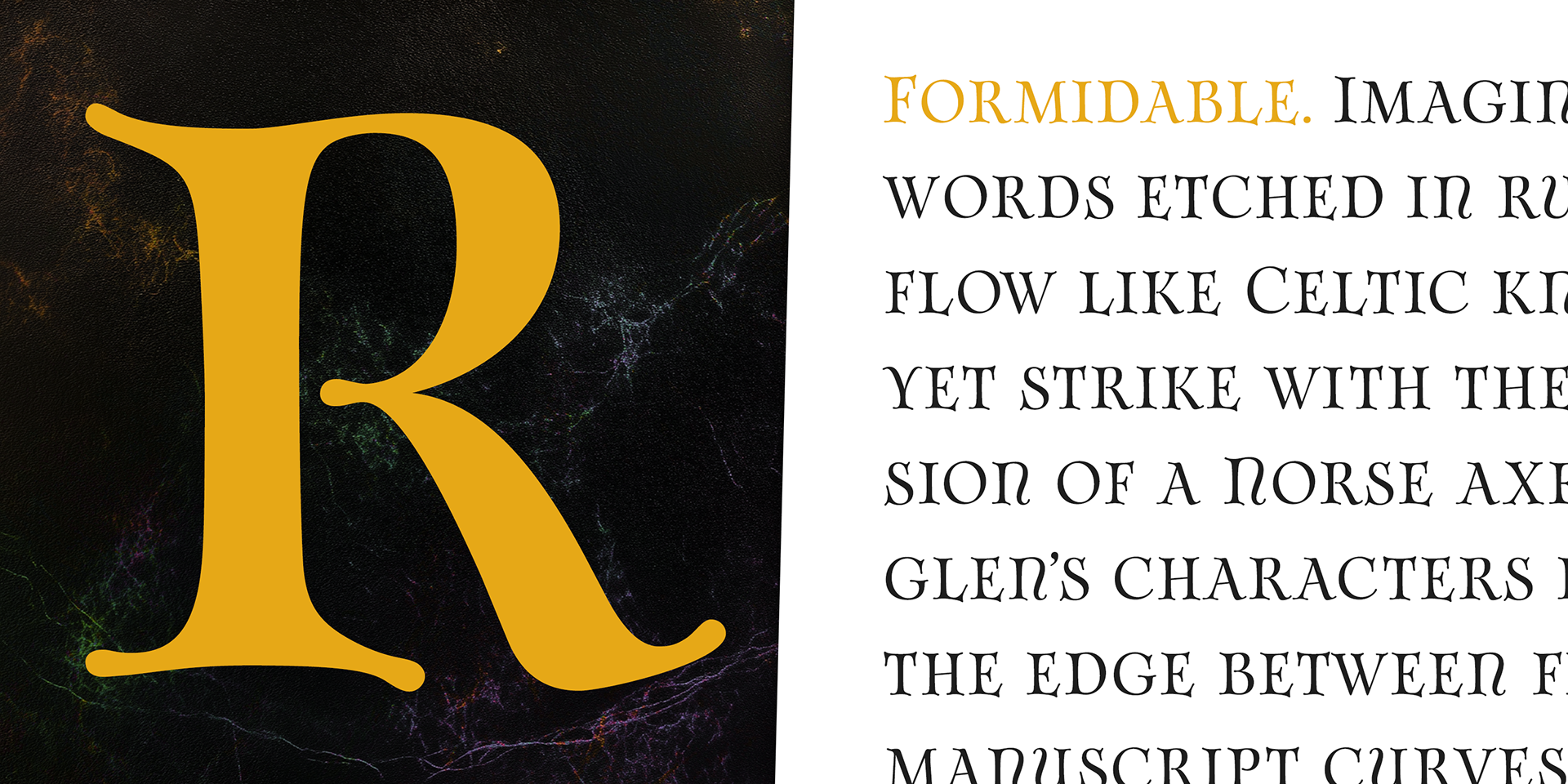 Embark on a typographic odyssey with Rossglen - where ancient uncial grace meets Viking ferocity. This isn't just a font; it's a portal to a world where Ireland's misty hills echo with battle cries and longships slice through northern seas.