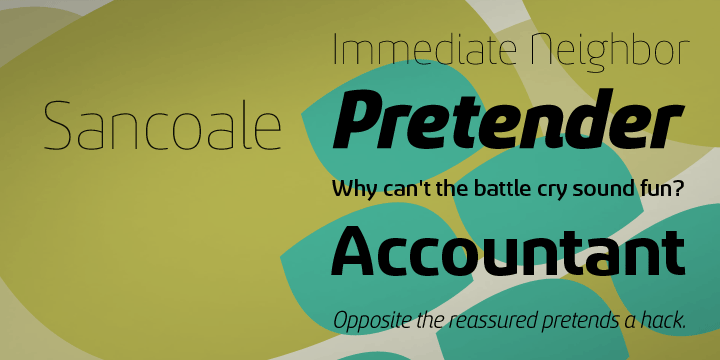 Sancoale is a new sans serif that is simple and geometric. It is a contemporary design that is distinctive and unique, but not too far outside the box. This makes for a typeface family that is very useful for many applications. The design is simplified without stems or spurs in the default character set. The OpenType alternates do include alternates with stems, and there are six weights with true italics. Please see the informative .pdf brochure to see these features in action.